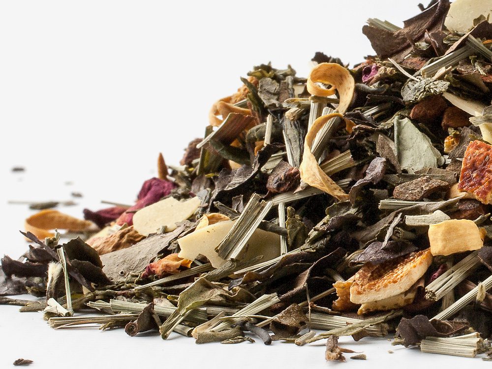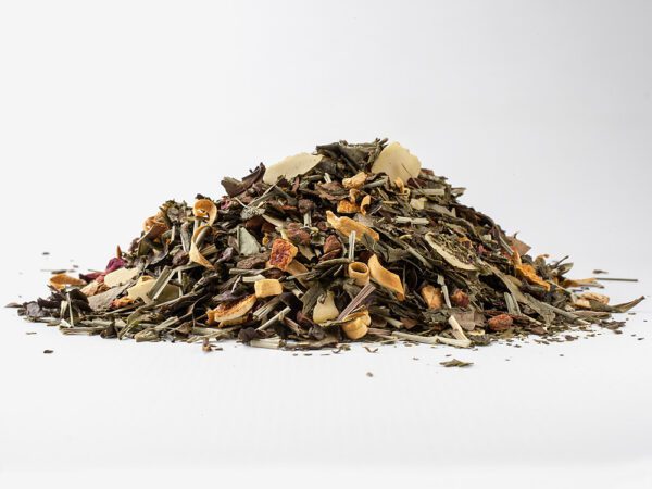 Opis: Biała i zielona herbata z Chin, cynamon, czarna herbata, skórka pomarańczowa, migdały, trawa cytrynowa, kwiaty i olejek pomarańczowy, płatki róży, zapach. Deklaracja wartości odżywczych na 100 ml: