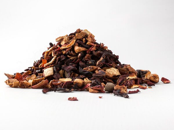 Opis: Jabłko, hibiskus, rodzynki (winogrona, olej słonecznikowy), owoc róży, skórka pomarańczowa, ananas (ananas, surowy cukier trzcinowy, regulator kwasowości: kwas cytrynowy), papaja (papaja, surowy cukier trzcinowy, regulator kwasowości: kwas cytrynowy), róża, truskawka, malina, zapach. Bez kofeiny. Wartość odżywcza na 100 ml: