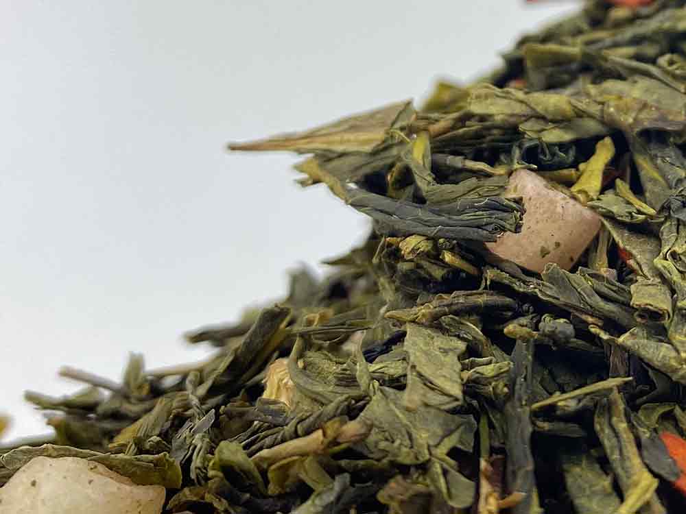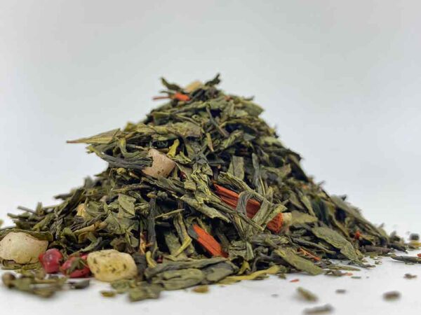 Opis: Zielona herbata Sencha, ananas (ananas, cukier, regulator kwasowości: kwas cytrynowy), papaja (papaja, cukier), aromat, lukrecja, drzewo sandałowe, czerwony pieprz, rumianek rzymski. Wartość odżywcza na 100 ml: