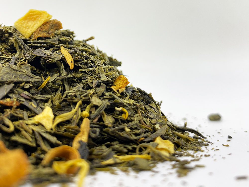 Opis Zielona herbata Sencha i proch strzelniczy w połączeniu z guawą 4% (przecier jabłkowy, przeciwutleniacz: kwas askorbinowy, przecier z guawy, sok jabłkowy), marakują 2,7%, kwiatami pomarańczy i nagietkiem. Spożywać na ciepło lub na zimno bez dodatku cukru. Deklaracja wartości odżywczych na 100 ml: Energia 18 kJ />4 kcal. Tłuszcz <0,1 g, w tym nasycone <0,1 g. Węglowodany <0,1 g, w tym cukry <0,1 g. Białko <0,1 g. Sól <0,3 g.
